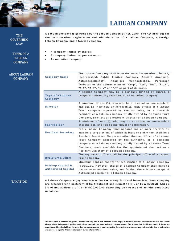 Advantages of labuan company registration. B) transactions between labuan entities that have opted to pay tax under the income tax act and malaysian residents; There are currently no known outstanding effects for the labuan trust companies act 1990 (repealed). An act to amend the law relating to companies and to provide for related matters. The labuan companies act of 2010 currently oversees the formation, activities, and taxation of a labuan.