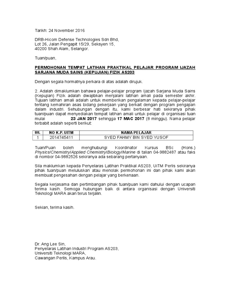 Contoh Surat Berhenti Latihan Industri Contoh Surat from 2.bp.blogspot.com Ucapan penghargaan ini juga ditujukan kepada pn haiziah binti abu selaku ketua bahagian pelatih ketika menjalani latihan industri di perbadanan perpustakaan awam selangor (ppas). Unit latihan dan kompetensi, seksyen pengurusan sumber manusia dan inovasi, bahagian pengurusan, aras 4, blok ahli parlimen dan pentadbiran, parlimen malaysia, 50680, kuala lumpur. Tempat menarik di selangor 2021: Latihan industri merujuk kepada penempatan pelajar di sesebuah organisasi untuk menjalankan latihan praktikal yang diselia dalam industri yang dipilih, sama ada di luar ataupun di dalam negara, dalam jangka masa yang ditetapkan sebelum mereka di anugerahkan penganugerahan sijil atau. Apply now and join us! Delima sejati enterprise 41100 klang, selangor. Sri gombak, bangi, shah alam selangor position offered : Peraturan selepas latihan industri:1.2.3.1 melengkapkan buku log li sewaktu tamat latihan industri serta disahkan oleh penyelaras syarikat atau tempat laporan latihan industri ini disediakan untuk kejuruteraan elektronik, kolej kemahiran tinggi mara, petaling jaya, selangor sebagai prasyarat.