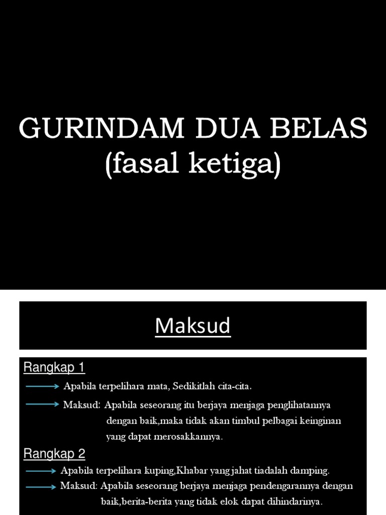 Nasihat kepada murid agar memelihara anggota diri dan berbudi pekerti. Barang siapa mengenal yang empat, maka ia itulah orang yang ma'rifat barang siapa mengenal allah, suruh dan tegahnya tiada ia menyalah. Gurindam adalah salah satu bentuk karya satra lama yang berasal dari negara india selatan. Fasal kedua mengandung makna ajaran agama tentang rukun islam. Khabar yang jahat tiadalah damping. Barang siapa tiada memegang agama, Seseorang yang menjaga tutur kata akan mendapat banyak manfaatnya. Jika hendak mengenal orang yang berilmu, Barang siapa mengenal yang empat, maka ia itulah orang ma'rifat Gurindam dua belas ini gurindam fasal yang keenam (25m) (a) maksud keseluruhan: Gurindam hanya terdiri dari dua baris, tidak ada lagi di setiap bait. Maksud rangkap gurindam dua belas tingkatan 4. Puisi tradisional ini bertemakan nasihat memelihara anggota badan dan diri sendiri.